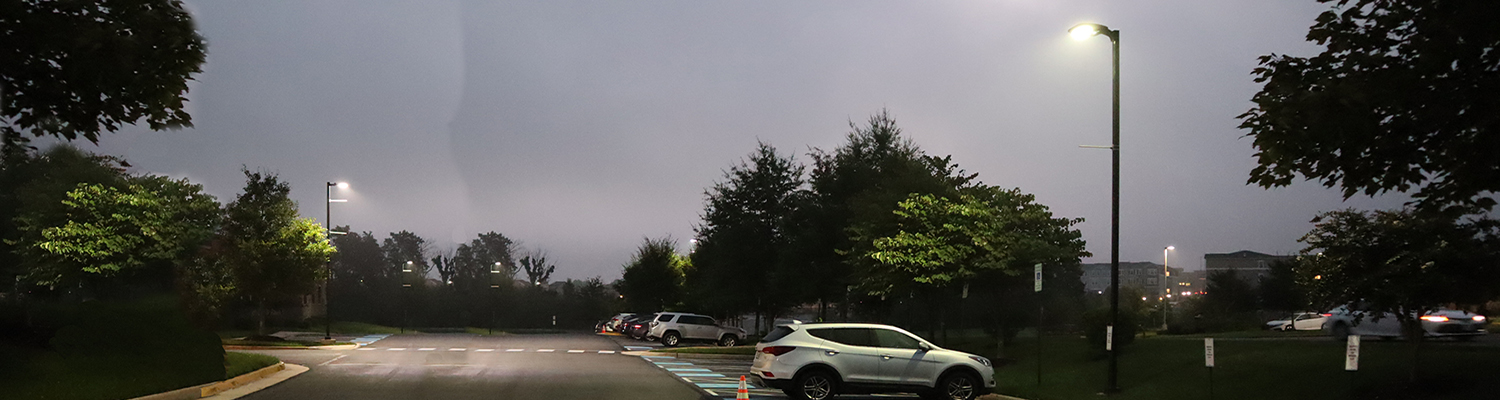 The outdoor lighting was enhanced at this multi-use flex space by retrofitting LED bulbs into existing poles. Converting to LED will eliminate maintenance time and save on longer lasting bulbs.